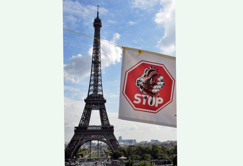 A banner against organ harvesting hung in front of the Eiffel Tower in Paris during a protest in 2013. (Kenzo Tribouillard/AFP)