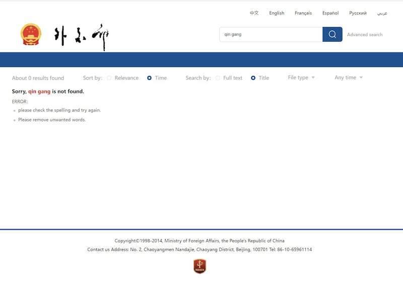 All references to Qin and his activities as foreign minister have been removed from the Ministry of Foreign Affairs website, but he continues to be listed elsewhere as a state councilor and references to his tenure as ambassador to the U.S. continue to exist.
