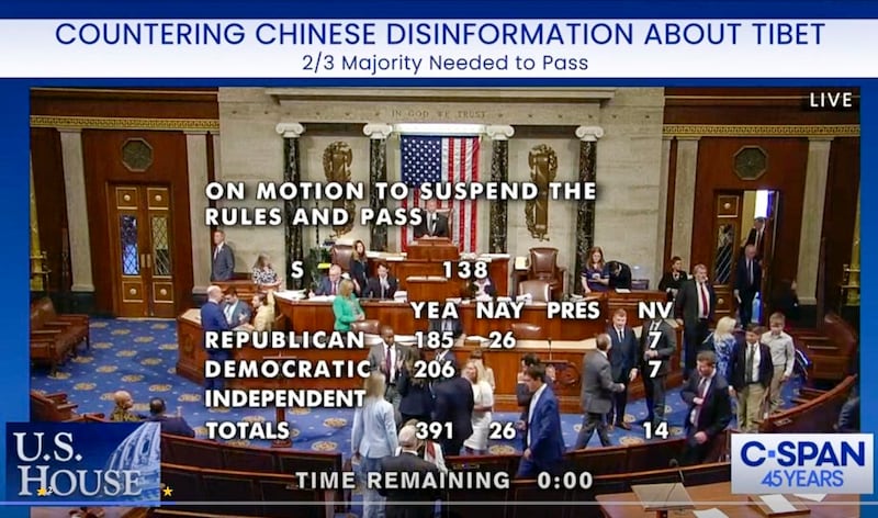 The legislation, which passed the House of Representatives on June 12, states that Tibetans share a distinct religious, cultural, linguistic and historical identity and encourages the State Department to fight China's disinformation about Tibet's history and institutions.